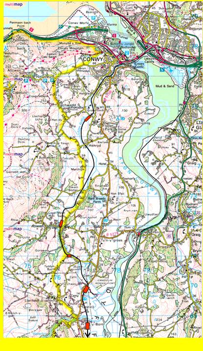 along the Vale of Gyffin, then via Dolgarrog and Trefriw on the western side of