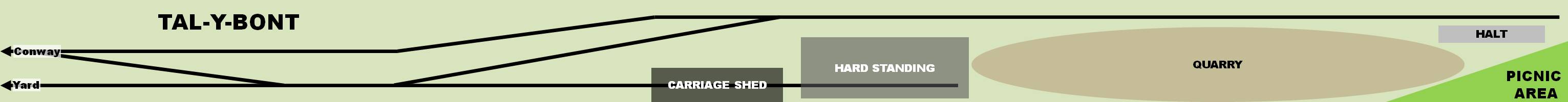 HISTORY Between the 1850’s and 1910’s there were plans to build a railway from Conway along the Vale of Gyffin, then via Dolgarrog and Trefriw on the western side of the Conway Valley to Llanrwst. The only outcome was a short light railway build to service the Aluminium plant at Dolgarrog. I have rewritten history with the proposal in 1908 of the 10.5 mile long Abbey, Dolgarrog & Trefriw Light Railway approved in 1910 by the Dolgarrog Light Railway Order coming to fruition and like the Derwent Valley [Light] Railway being neither grouped (1923) nor nationalised (1948). In 1926 regular passenger services were withdrawn but workman’s trains continued to stop at the railway’s low platforms until 1932. Goods traffic was largely and by the 1950’s wholly moved in mainline goods wagons. In 1960 the Aluminum plant at Dolgarrog, switched to road transport and the railway between Tal-y-bont and Llanrwst closed. In 1969 the railway broke with tradition and replaced its hired locomotives with two diesel locos bought from British Rail. 1971 bought a preservation group who carried passengers in brake vans and converted open wagons. The layout is set in 1973-4 during the introduction of the TOPS. The light railway continues to run goods trains for outward bound timber in 16 ton mineral wagons and aggregate in TOPS coded tipplers. The preservation group runs passenger service weekends bank holidays and summer weekdays. The preservationists built a carriage shed, halt and picnic area.