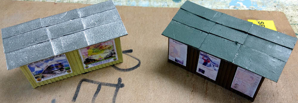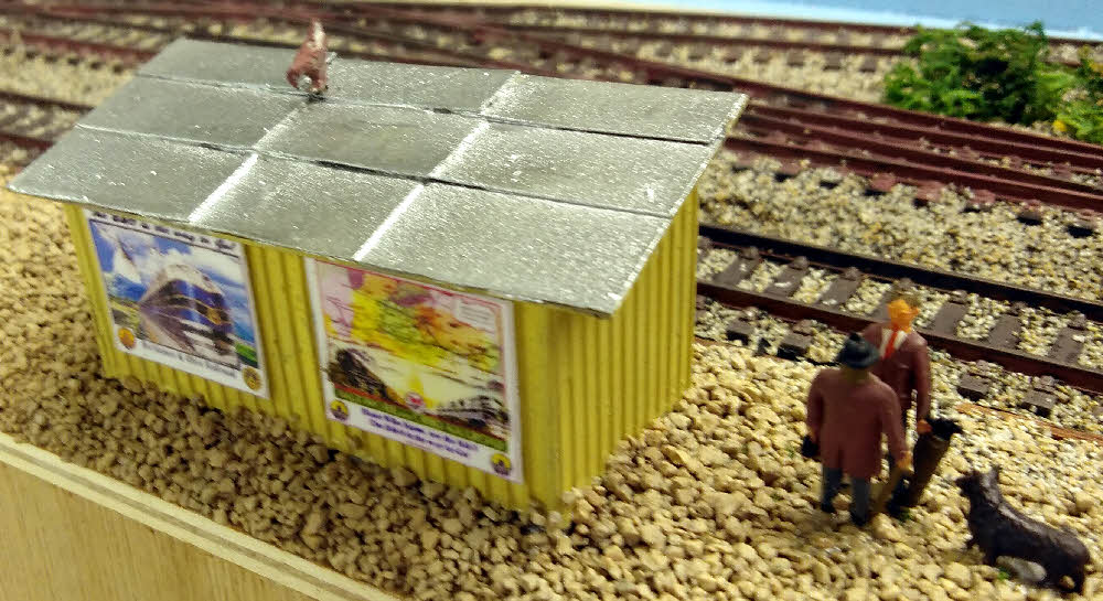 The facilities are generous with toilets, two shelters, notice boards and bins. These station facilities seemed adequate for Potomac Street. All fired up I tried to order the styrene I needed from Hatton's. Unfortunately the roofing styrene was out of stock. The next problem was a careful measure showed that the platforms on both layouts were too narrow to take even the planned compressed version of Grandview. I therefore was reduced to British style bus stop shelters. To Americanise them I used board and baton walls and tar paper (felt) roofs. The felt is fine wet and dry was cut to 8 by 4 sheets before being stuck on. This gives a more prototypical appearance but is a tad tedious but not as bad as the headend house on Willis Bluff that had over 200 sheets. I painted Grandview's in the nearest colour I could find to the prototype and Potomac Street is painted in B&O cream. Some years ago I asked Earnest what was the best paint for my felt roofs. He told me of a specialist paint with aluminium powder that floats to the surface when setting giving a reflective surface that makes the felt last longer. If it was helpful in tropical Epsom it would be even more appropriate in Washington. Hence the garish roof. I then added homemade posters extolling the Chugach Forest and the B&O. The huts were then stuck on the layouts and details added. I was Spartan with details as neither station would see many passengers.
