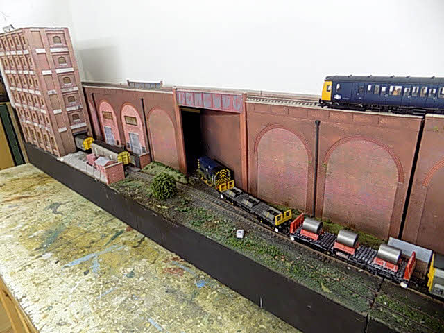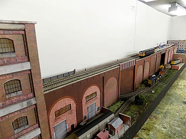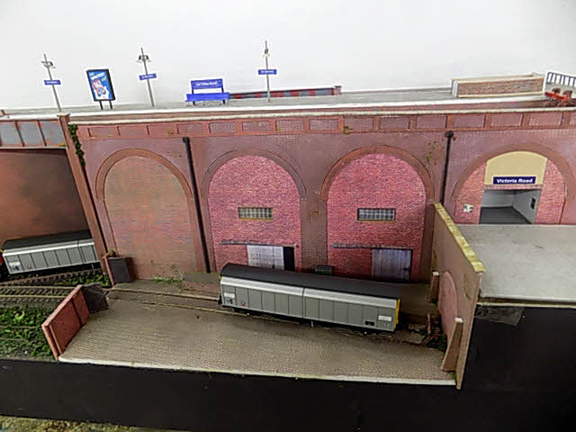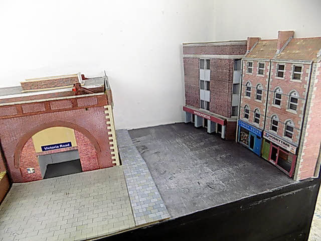 David B and I designed Victoria Road or as it was originally called Victoria Street to break away from the normal industry in a rural setting and to avoid the problems with another layout by automating the passenger service & adding a goods service. We also took into account the normal constrains of cost, size, transport, storage, handling and technical factors like a decision to use pattern makers dowels to give smoother running over joints. After considering French, West German, East German, Czech, and America it was decided to go British 00 as the most popular outline. The availability of British 00 stock meant Victoria Road had to be set in the late 1980’s as the Class 121 diesel multiple unit in rail blue dwindled after 1986 as they were repainted into Network SouthEast livery, Class 09 in rail blue dwindled under post 1982 sectorisation as they were repainted in Railfreight gray and wagons are in Railfreight gray livery (1982-97) that wasn't wide spread till the late 80's. The next decision was where to locate the layout. Given the stock Victoria Road had to be in the London area so the next stage was to develop a background story - Victoria Road was a station on a line down to the London Docks that in the 1960's closed south of Victoria Road but a passenger service was maintained using Diesel Multiple Units and in the 1970's the track was rationalised into two reversible track as happened, at one point, to Blackpool South. Given we were in East London I had thoughts about Something Walford but sternly repressed them as it's an overused name. As the layout was set in London it was decided to go for a 24” high back scene allowing the a upper level 'mainline', a low level goods yard, and a 17” roof lines so plenty of tall buildings. The 24" high back scene meant the layout would be operated from the front. It was decided to operate from the fiddle yard end so goods stock had to be fitted with KD couplings and a magnet placed under the track for automatic operation. The upper level line was to be on a viaduct coming from behind buildings and ending at the station with the viaduct split by were the low level line passes underneath. The viaduct arches are used by small industries and one or two rail served industry such as a wine importer. The viaduct height was determined by clearance needed to handle stock in the fiddle yard. Track passing under the viaduct was made accessible by flaps in back scene and to ease maintenance no track crosses baseboard joints under the viaduct. The back scene was, initially, to be a combination of very low relief buildings and a Peco photo back scene possibly SK-20 Port/dock scene with ships at berths. I built the baseboards, installed the track and wired the layout. David's built the buildings etc. Nigel Ca. offered to paint the back scene. At that point for a variety of reasons development stopped.