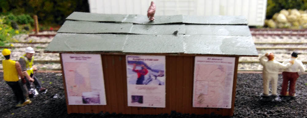 The facilities are generous with toilets, two shelters, notice boards and bins. These station facilities seemed adequate for Potomac Street. All fired up I tried to order the styrene I needed from Hatton's. Unfortunately the roofing styrene was out of stock. The next problem was a careful measure showed that the platforms on both layouts were too narrow to take even the planned compressed version of Grandview. I therefore was reduced to British style bus stop shelters. To Americanise them I used board and baton walls and tar paper (felt) roofs. The felt is fine wet and dry was cut to 8 by 4 sheets before being stuck on. This gives a more prototypical appearance but is a tad tedious but not as bad as the headend house on Willis Bluff that had over 200 sheets. I painted Grandview's in the nearest colour I could find to the prototype and Potomac Street is painted in B&O cream. Some years ago I asked Earnest what was the best paint for my felt roofs. He told me of a specialist paint with aluminium powder that floats to the surface when setting giving a reflective surface that makes the felt last longer. If it was helpful in tropical Epsom it would be even more appropriate in Washington. Hence the garish roof. I then added homemade posters extolling the Chugach Forest and the B&O. The huts were then stuck on the layouts and details added. I was Spartan with details as neither station would see many passengers.