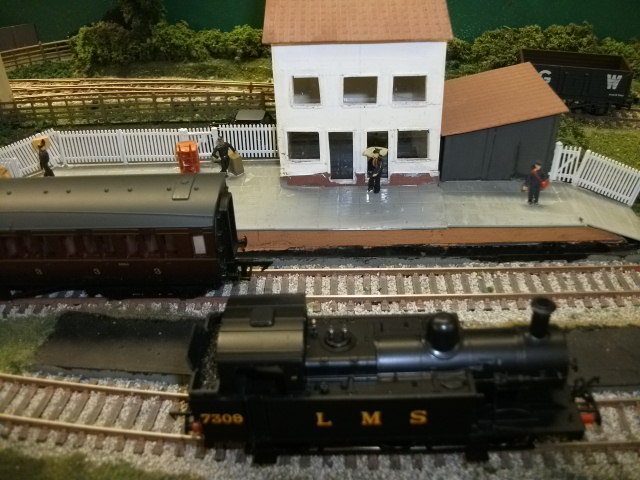 A passenger train hauled by a 'jinty' arrives at Vale Crucis and the loco runs